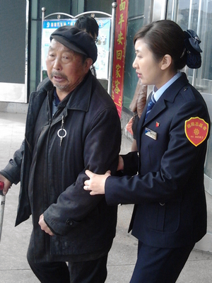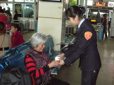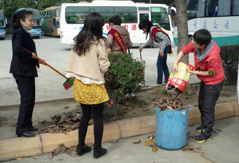 志愿者们本着“服务他人、快乐自己”的心态,积极主动投入到各项服务活动中去。他们想旅客所想、急旅客所急,看到带着大宗行李出行的旅客,志愿者立即主动用行李车帮助旅客运送行李;看到上了年纪的旅客行动困难,志愿者上前搀扶老人,嘘寒问暖,为老人解决困难,传递一份温馨和温暖;面对现在闷热的天气,志愿者还不时的为旅客送水,并通过广播不断播放温馨提示;志愿者仔细检查车站的每个卫生死角,认真清理垃圾,在广场、在停车场,由于冬季刚过,每天有大量的落叶,草坪里有烟头、瓜子壳等垃圾,志愿者用扫帚扫,用手捡,把车站环境整理得干干净净。