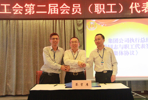 按照既定议程,集团公司执行总经理曹勇代表集团行政与职工代表顾建军、赖同斌签订了《工资集体协议》。
