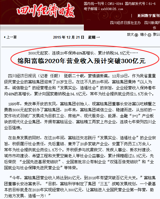 绵阳富临2020年营业收入预计突破300亿元