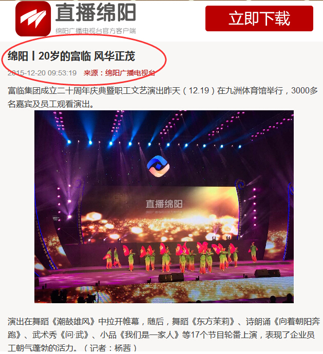 本网讯 12月19日,富临集团举行“同心创未来”二十周年庆典受到各界关注,活动当日到场媒体十余家,富临二十周年庆典活动被四川经济日报、绵阳日报、绵阳晚报、新华网、中国新闻网、四川新闻网、绵阳电视台、绵阳广播电台103.3、直播绵阳、大成网、西蜀网等多家新闻媒体争相报道,并受到光明网等新闻网站的转载报道,全方位展现了富临企业风采。