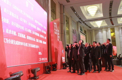 会上,发放了所属各企业的2015年度考核结果。安董事长和李亿中总经理签订了经营班子2016年度《经营管理目标考核责任书》;李亿中总经理和所属企业总经理分别签订了2016年度《工作目标责任书》。随后,在李亿中总经理的带领下,签订了《工作目标责任书》的企业总经理庄严宣誓,承诺将遵守约定,认真履职,团结和带领全体员工坚决完成2016年度工作目标任务。